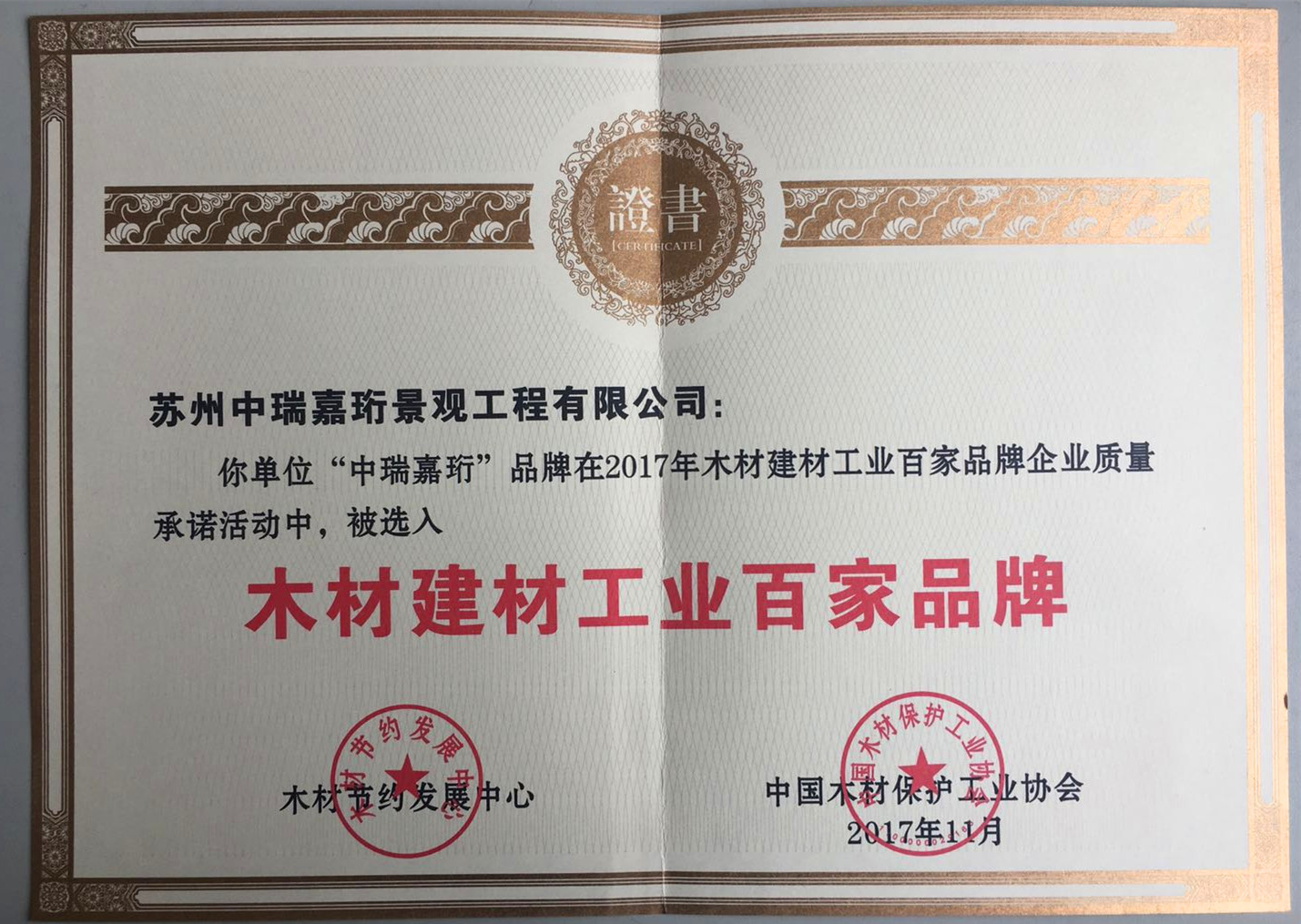 我公司榮獲榮獲2017年中國木材保護協(xié)會頒發(fā)《木材建材工業(yè)百家品牌》之一稱號。
